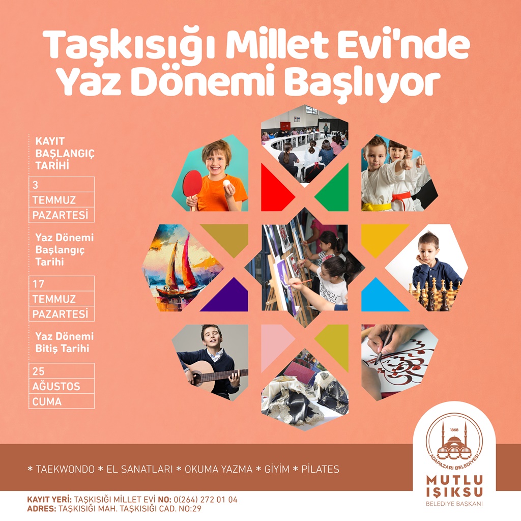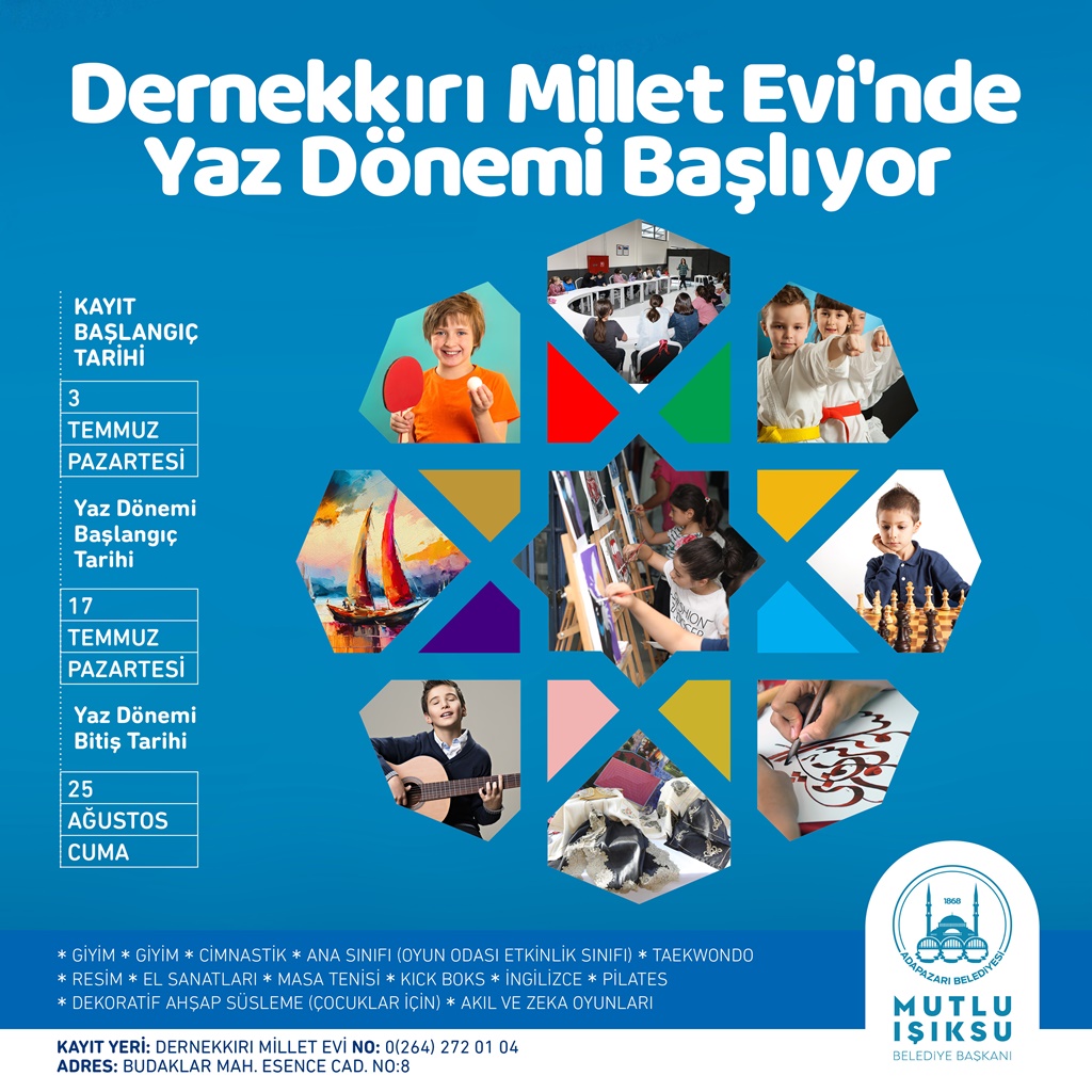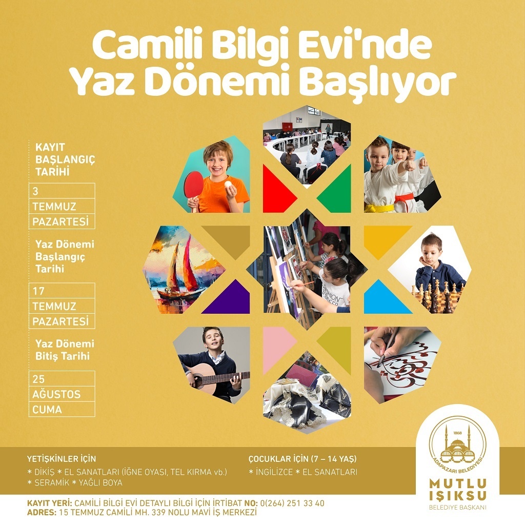 Adapazarı Belediyesi Kültür İşleri Müdürlüğü’ne bağlı olarak hizmet veren Merkez (Yuvam Sokak), 15 Temmuz Camili ve Yağcılar Bilgi Evleri ile Dernekkırı ve Taşkısığı Millet Evleri’nde yaz kursları başlıyor. Başkan Mutlu Işıksu yaptığı açıklamada, Adapazarı’nın eğitim yaşamına her daim destek olduklarını vurguladı ve ilgilileri yaz kurslarına davet etti.